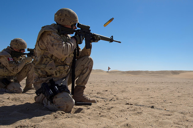 Photo: Canadian soldiers honing their shooting skills on the firing range in a desert environment (2015) by Canadian Forces Combat Camera via Flickr. Photo courtesy of the Canadian Forces Combat Camera, Department of National Defense.